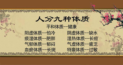 體質(zhì)類型的分類方法很多,每個人的體質(zhì)構(gòu)成也十分復(fù)雜,各不相同;倔w質(zhì)類型包括:平和質(zhì)、氣虛質(zhì)、陽虛質(zhì)、陰虛質(zhì)、痰濕質(zhì)、濕熱質(zhì)、血瘀質(zhì)、氣郁質(zhì)、特稟質(zhì);以“平和質(zhì)”最為理想。
