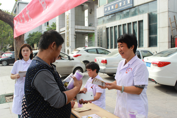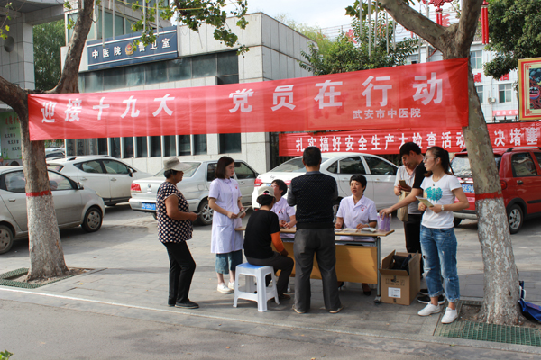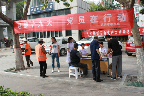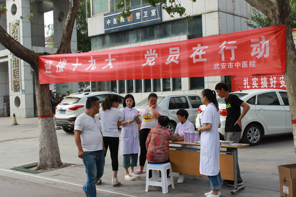 為迎接黨的十九大勝利召開,繼承和發(fā)揚黨的優(yōu)良傳統,切實加強黨的基層組織能力建設,同時為更好的普及中醫(yī)藥文化知識,倡導健康生活方式,提高人民群眾身體素質。9月8日下午,市中醫(yī)院由副院長孔利霞帶隊,組織黨員醫(yī)護工作者走上街頭,開展以“迎接十九大,黨員在行動"為主題的義診宣傳活動。活動主要分為健康咨詢、測血壓、發(fā)放健康教育宣傳資料等。